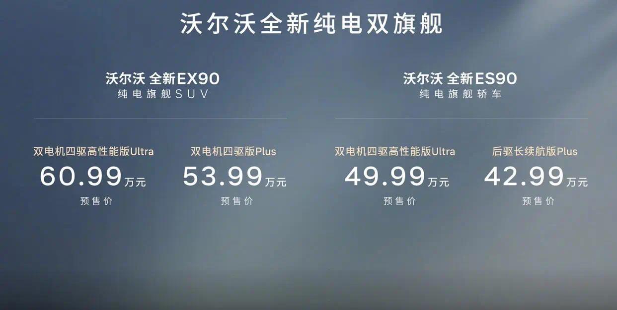 【文/财圈社&道哥说车 张浅】4月15日,沃尔沃汽车99周年庆典暨新品发布会在国家会议中心举行,全新纯电旗舰SUV沃尔沃EX90和全新纯电旗舰轿车沃尔沃ES90正式开启预售,其中沃尔沃EX90双电机四驱版Plus预售价53.99万元、高性能版Ultra预售价60.99万元,沃尔沃ES90后驱长续航版Plus预售价42.99万元、双电机四驱高性能版Ultra预售价49.99万元。