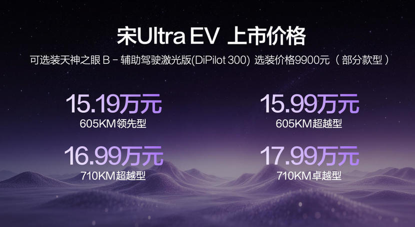 宋Ultra EV15.19万元起震撼上市!引领B级SUV进入闪充时代 比亚迪王朝宋Ultra EV 共4款车型,包括605KM领先型、605KM超越型、710KM超越型和710KM卓越型,官方指导价15.19万-17.99万元。新车全系搭载比亚迪第二代刀片电池及闪充技术,同时拥有710公里CLTC纯电续航、天神之眼B、云辇-C、TBC高速爆胎稳行系统等豪华配置,为消费者带来全新的纯电出行方式,全面开启闪充时代。