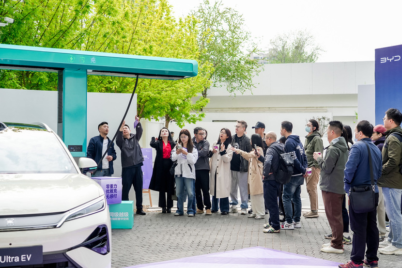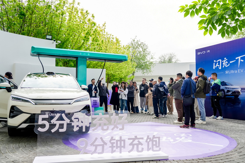 全系搭载第二代刀片电池及闪充技术,宋Ultra EV开启B级SUV闪充时代 宋Ultra EV 搭载第二代刀片电池、闪充技术及激光雷达三大行业颠覆性技术。新车搭载的闪充技术带来出行新体验。常温下,5分钟电量告急秒“回血”,喝杯咖啡、刷会视频就能继续出发;9分钟从10%充到97%,节假日出行无需久留服务区。零下30℃也仅多3分钟。充电如加油,告别久等焦虑与规划,畅享纯电出行松弛感。现场特设一首歌的时间闪充体验区,嘉宾可现场直观感受,一曲唱罢,电量高效补能,闪充实力一目了然。