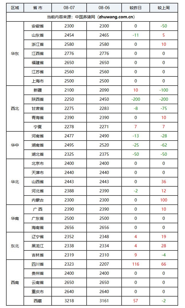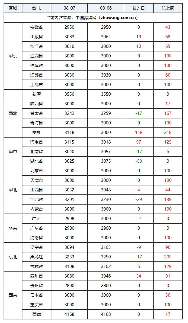 猪价上涨地区(9个):青海省、湖南省、湖北省、天津市、河北省、广东省、黑龙江省、吉林省、重庆市;上涨区间:0.02-0.20元/公斤;