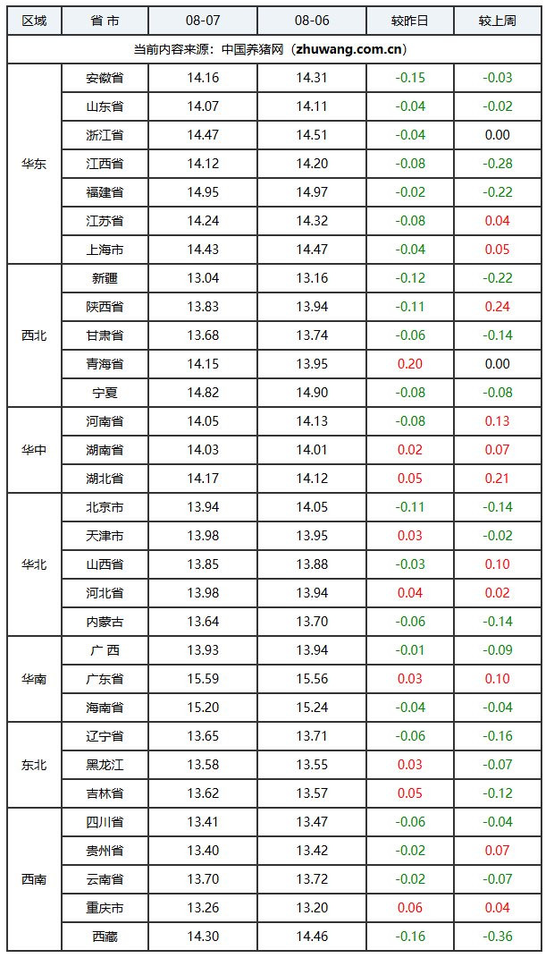 猪价下跌地区(22个):安徽省、福建省、宁夏回族自治区、江苏省、山西省、内蒙古自治区、西藏自治区、浙江省、广西壮族自治区、海南省、山东省、陕西省、河南省、北京市、辽宁省、江西省、上海市、新疆维吾尔自治区、甘肃省、四川省、贵州省、云南省;下跌区间:0.01-0.16元/公斤;