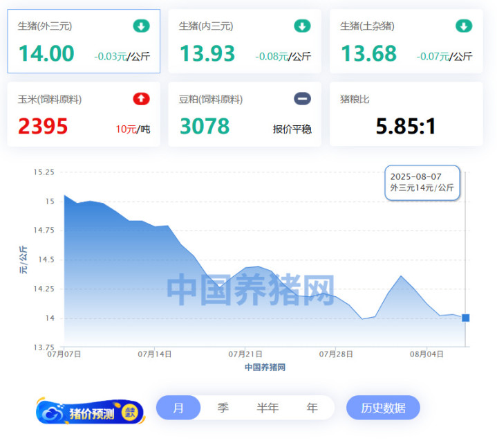 全国(生猪品种:外三元)均价为14.00元/公斤,猪价较昨日下跌0.03元/公斤,环比下跌6.98%,同比下跌32.33%;