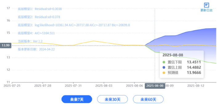 玄田算法是由项目课题组团队原创的非经典逻辑数值聚合理论和不确定性预测方法,构建了基于一致模算子的生猪价格预测模型。该模型采用的聚合函数及一致模相关理论与方法已获得多项国家5自然科学基金和省级自然科学资金资助,并获得多项省级自然科学奖奖项。08月08日预测猪价为13.9666,置信区间在13.4511--14.4882之间。08月09日预测猪价为14.0573;08月10日预测猪价为13.9116。