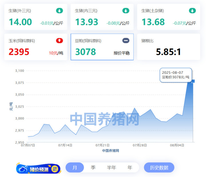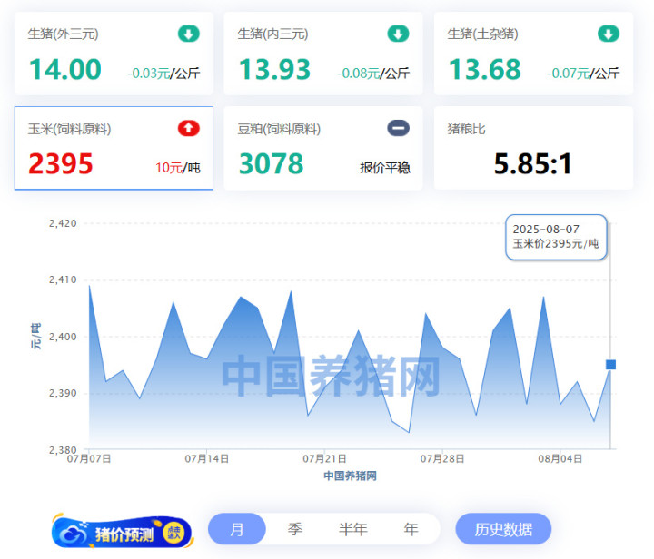 全国(生猪品种:内三元)均价为13.93元/公斤,猪价较昨日下跌0.08元/公斤,环比下跌4.46%,同比下跌30.59%;