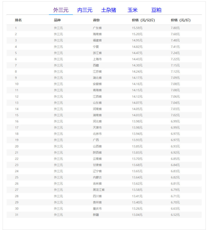外三元排行前三:广东省15.59元/公斤、海南省15.20元/公斤、福建省14.95元/公斤;